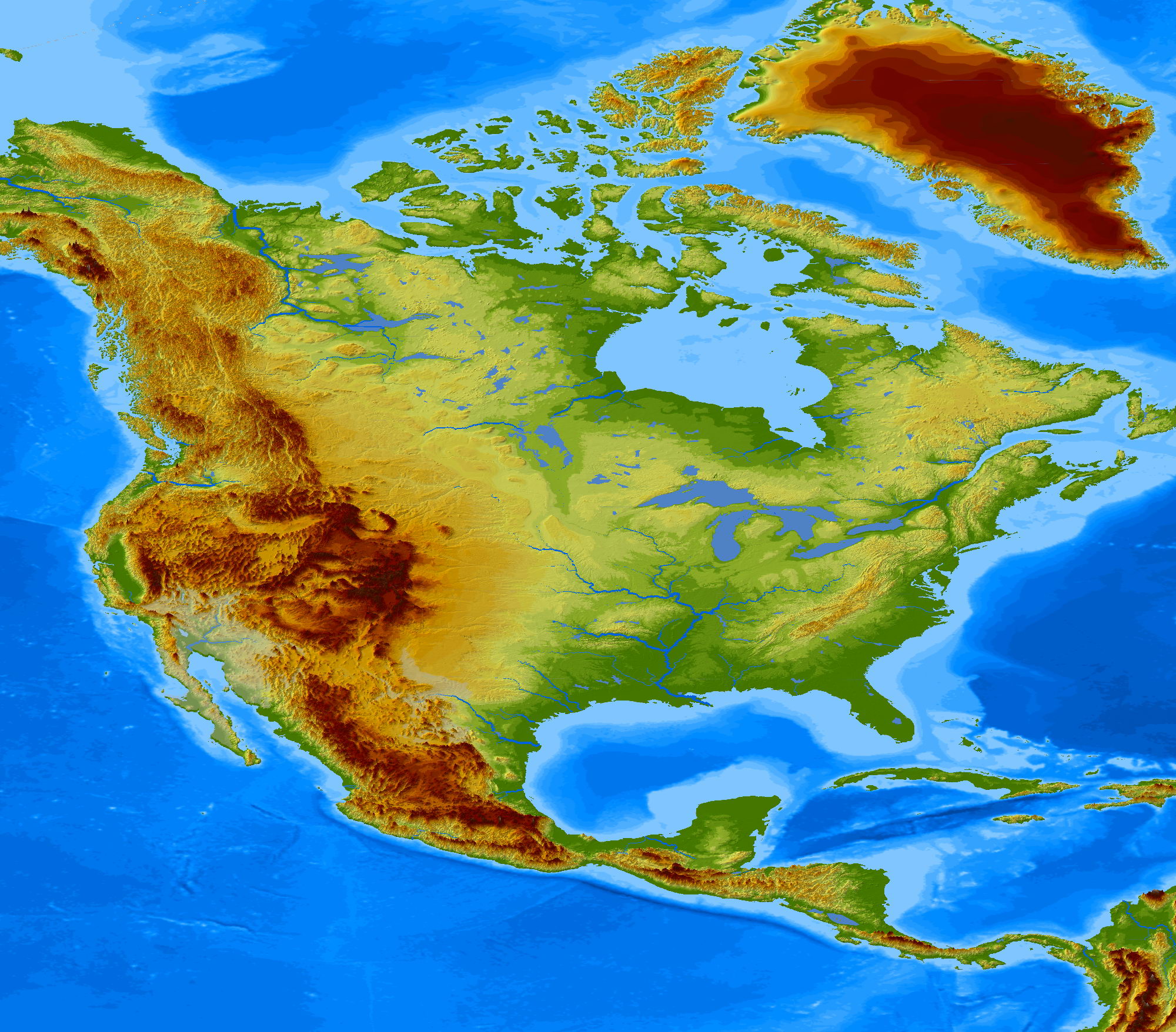Οι κύριοι ορεινοί όγκοι της Βόρειας και Κεντρικής Αμερικής βρίσκονται στο κεντροδυτικό τμήμα της. Τα Βραχώδη Όρη αποτελούνται από πολλές μικρότερες οροσειρές: Κάσκεϊντ (Όρη των Καταρρακτών), Κόουστ Μάουντενς (Παράκτια Οροσειρά), Σιέρα Νεβάδα (Λευκή Οροσειρά), Σιέρα Μάντρε Οσιντένταλ (Δυτική Οροσειρά) και Σιέρα Μάντρε Οριένταλ (Ανατολική Οροσειρά).
