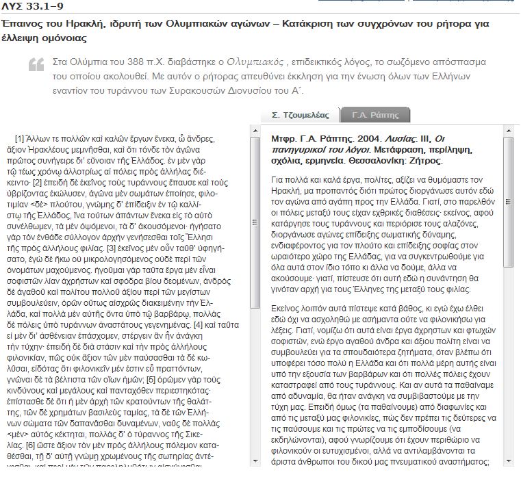 O Λυσίας στον «Ολυμπιακό» λόγο του (33.6) απευθύνει έκκληση για την ένωση όλων των Ελλήνων εναντίον του τυράννου των Συρακουσών Διονυσίου του Α΄: