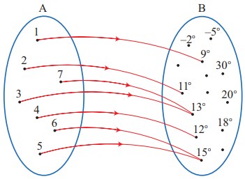Για τη συνάρτηση αυτή, το πεδίο ορισμού είναι το σύνολο Α = {1, 2, 3, 4, 5, 6, 7}, ενώ το σύνολο τιμών το σύνολο ƒ (Α) = {9o, 11o, 12o, 13o, 15o} ⊆ Β Με αφορμή το παράδειγμα αυτό τονίζουμε τα ακόλουθα χαρακτηριστικά μιας συνάρτησης