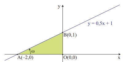 $λ = εφω = \dfrac{(OB)}{(OA)} = \dfrac{1}{2} = 0,5.$ Παρατηρούμε, δηλαδή, ότι η κλίση λ της ευθείας y = 0,5x + 1 είναι ίση με το συντελεστή του x. Γενικά, όπως θα αποδείξουμε στην Β' Λυκείου, η γραφική παράσταση της συνάρτησης ƒ(x) = αx + β είναι μία ευθεία, με εξίσωση y = αx + β, η οποία τέμνει τον άξονα των y στο σημείο Β(0,β) και έχει κλίση λ = α . Είναι φανερό ότι: